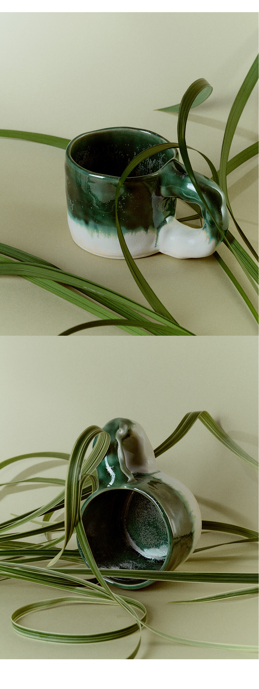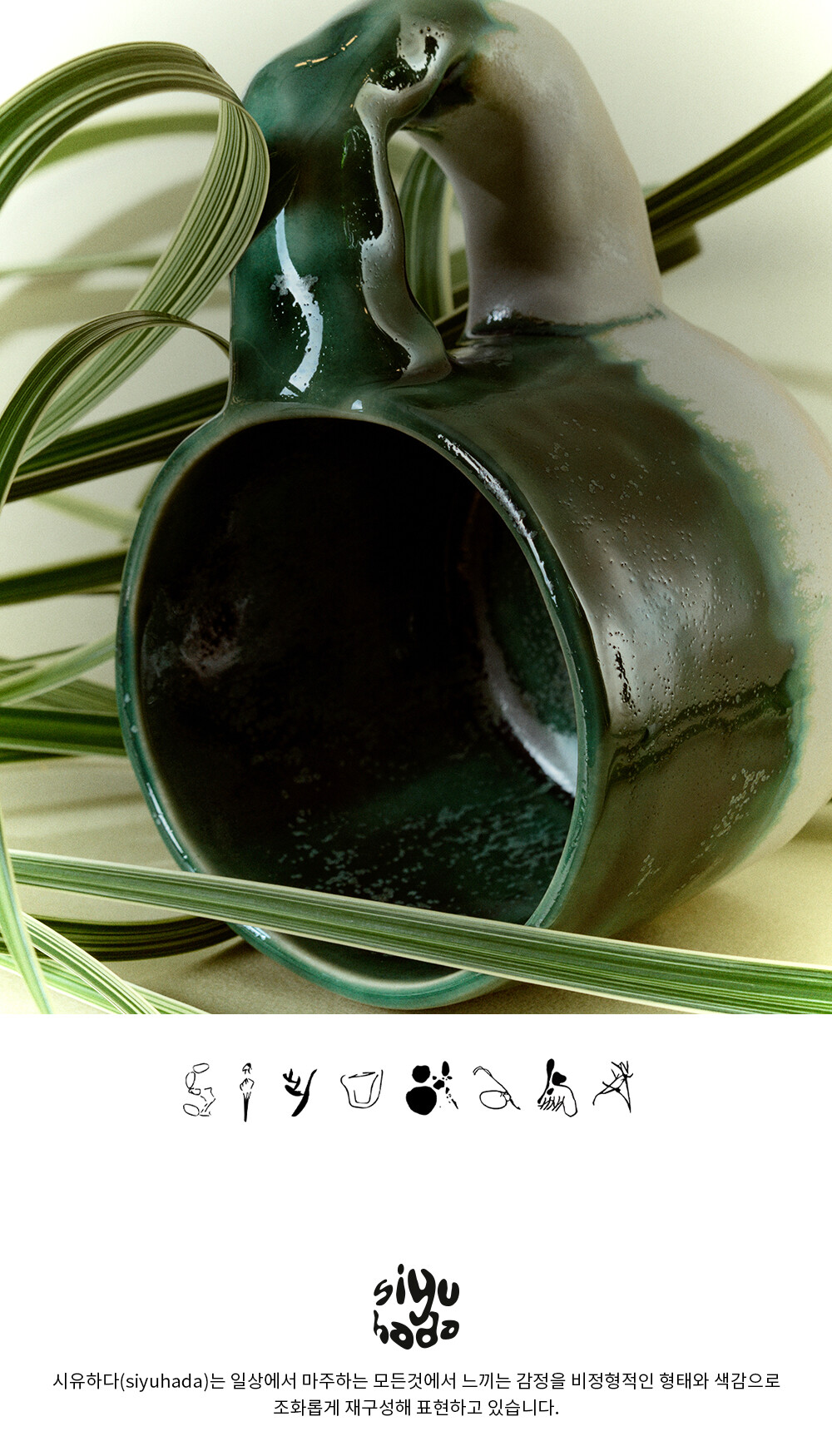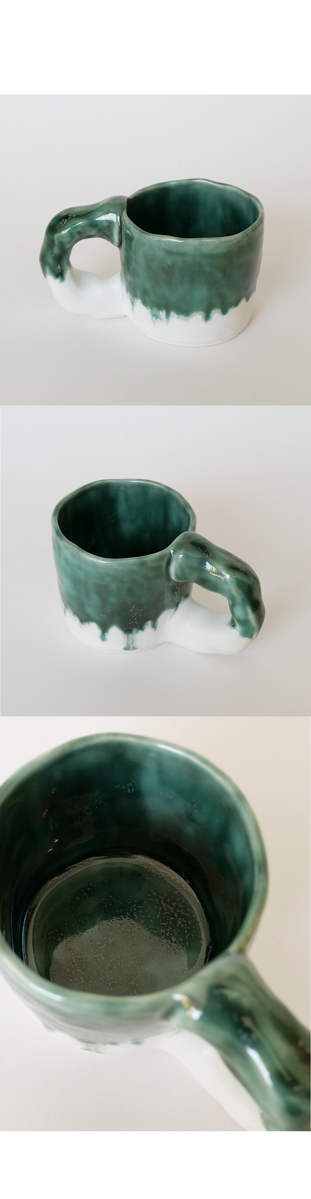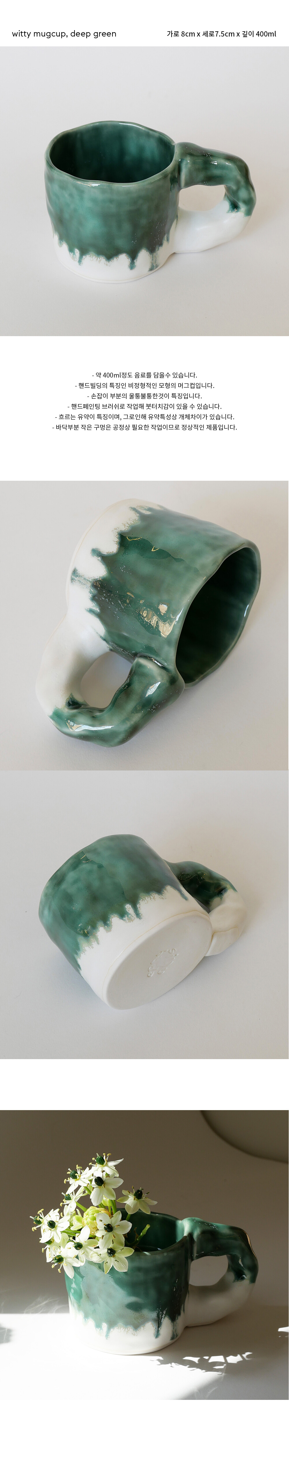 - 약 300ml정도 음료를 담을수 있음 - 핸드빌딩의 특징인 비정형적인 모형의 머그컵 - 손잡이 부분의 울퉁불퉁한것이 특징 - 핸드페인팅 브러쉬로 작업해 붓터치감이 있을 수 있음 - 흐르는 유약이 특징이며, 그로인해 유약특성상 개체차이가 있음 - 바닥부분 작은 구멍은 공정상 필요한 작업이므로 정상적인 제품입니다.