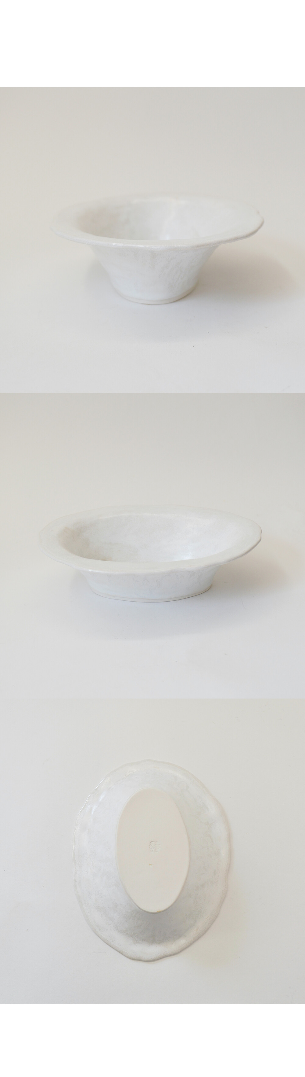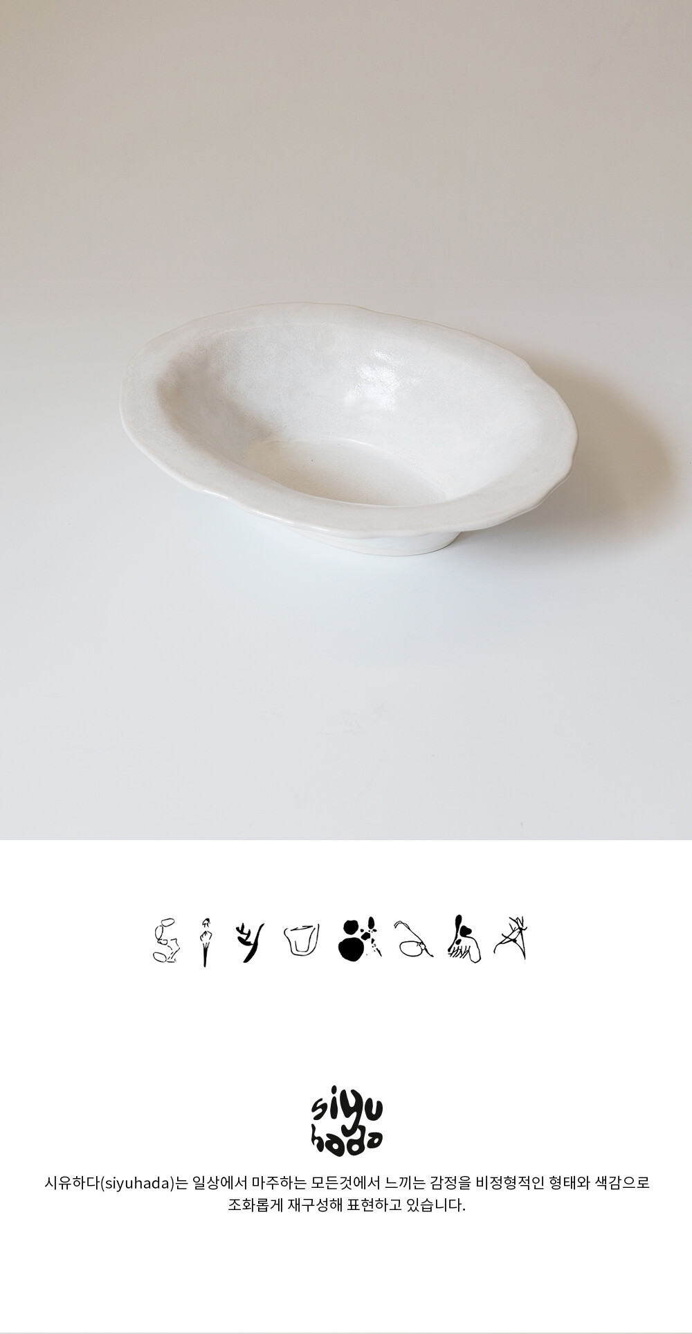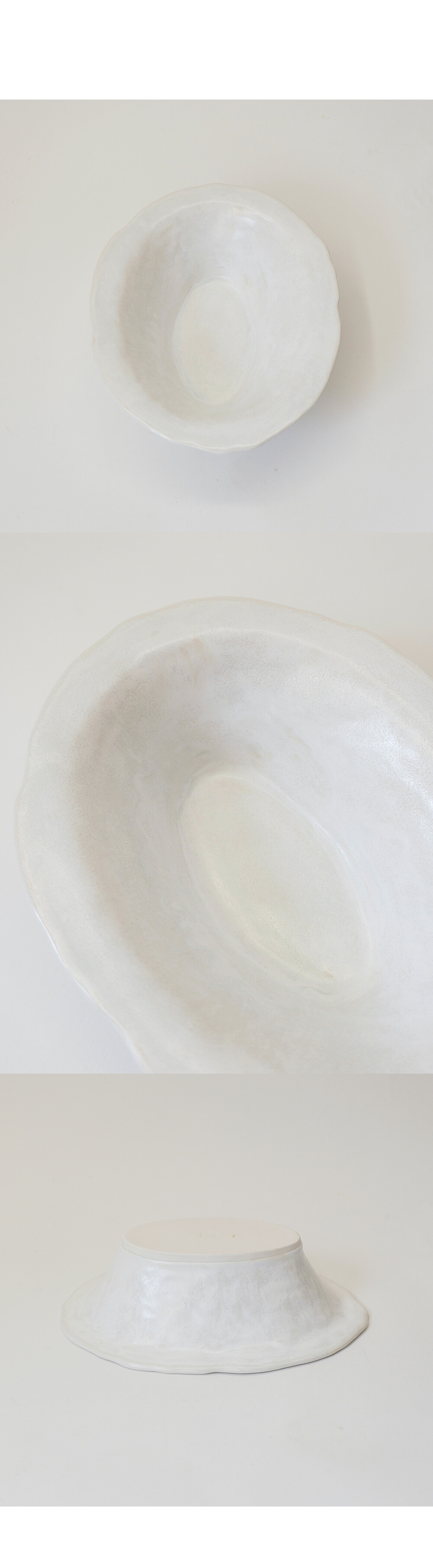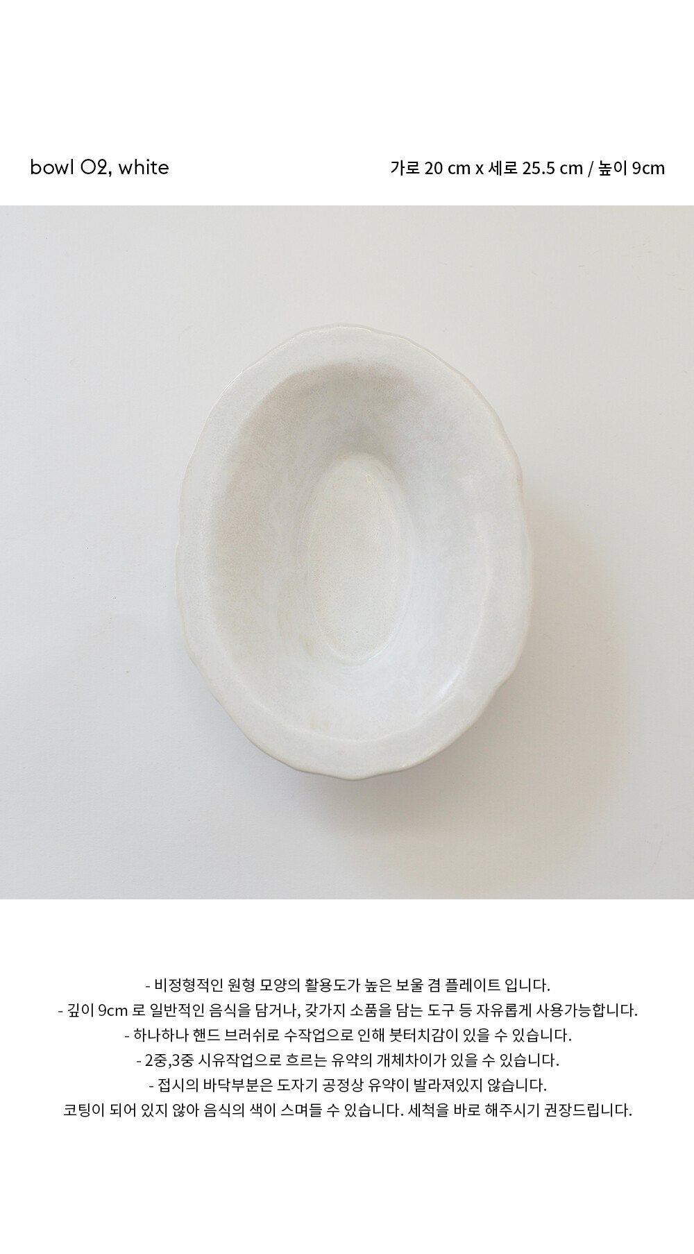 - 비정형적인 원형 모양의 활용도가 높은 보울 겸 플레이트 입니다. - 깊이 9cm 로 일반적인 음식을 담거나, 갖가지 소품을 담는 도구 등 자유롭게 사용가능합니다. - 하나하나 핸드 브러쉬로 수작업으로 인해 붓터치감이 있을 수 있습니다. - 2중,3중 시유작업으로 흐르는 유약의 개체차이가 있을 수 있습니다. - 접시의 바닥부분은 도자기 공정상 유약이 발라져있지 않습니다. 코팅이 되어 있지 않아 음식의 색이 스며들 수 있습니다. 세척을 바로 해주시기 권장드립니다.